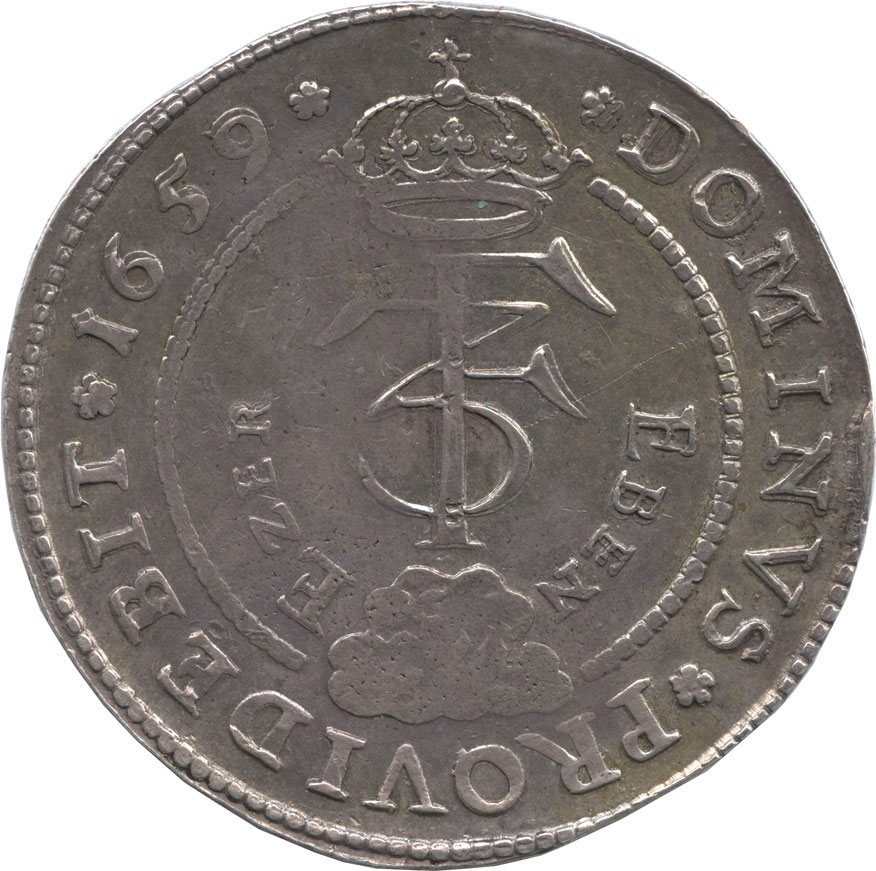1659年フレデリク3世治世下のデンマークで発行された2クローネ銀貨です。