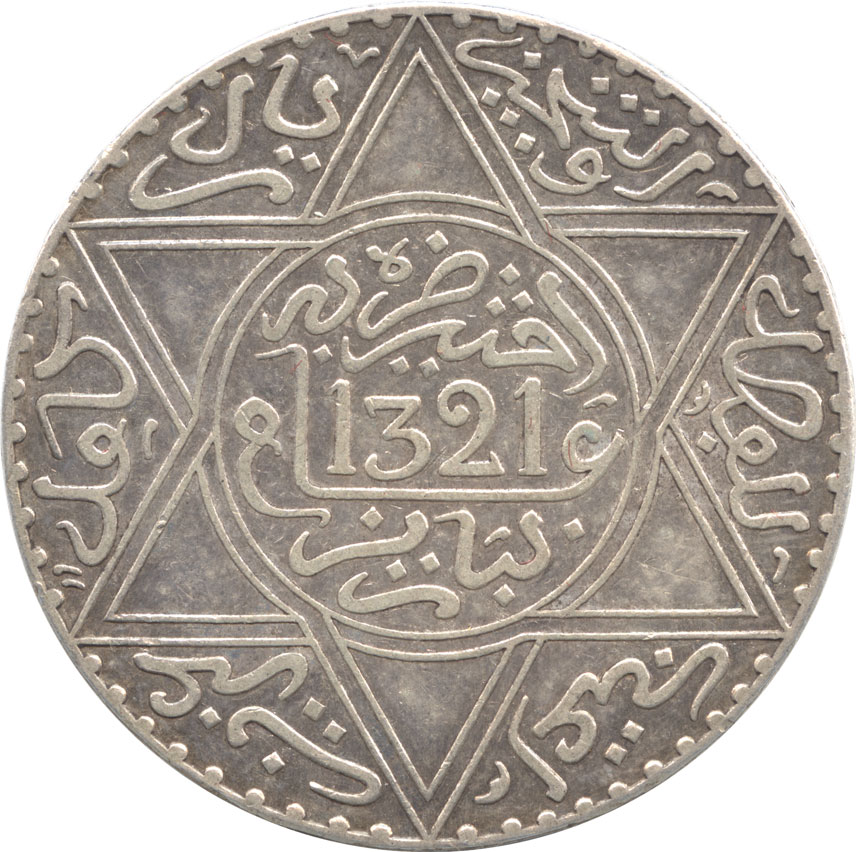 - モロッコ 1リアル銀貨(10ディルハム) AH1321(1903) アブドゥル・アジーズ1世(1894-1908) 極美品