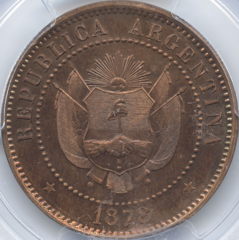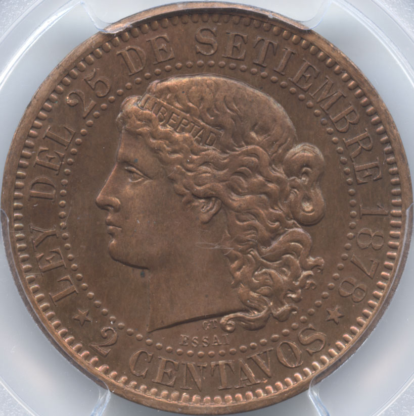 アルゼンチン 2センタボス試作銅貨 1878 女神頭像 PCGS-SP64RB プルーフ・未使用品
