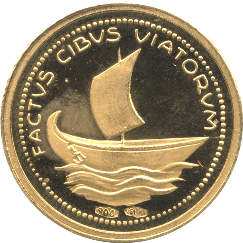 裏面には帆船が描かれ銘文「FACTVS CIBVS VIATORVM」は 「旅人の食べ物を作る」を意味します。