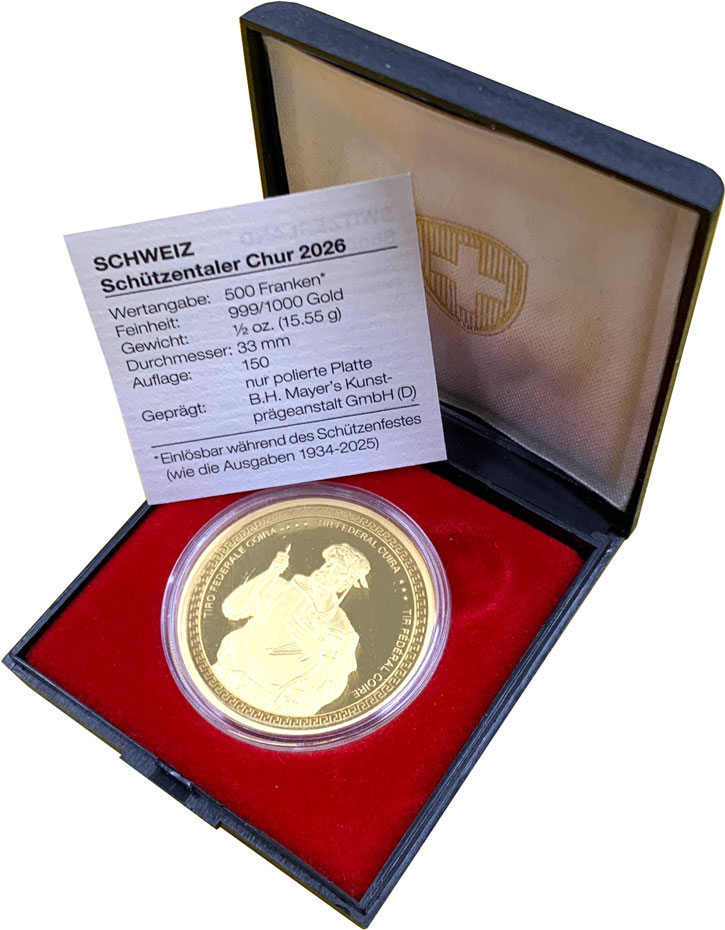 - 【2026年射撃祭記念】 スイス クール射撃祭 500フラン金貨 2026 プルーフ・完全未使用品 保証書・オリジナルケース付き 【発行枚数150枚の希少品】