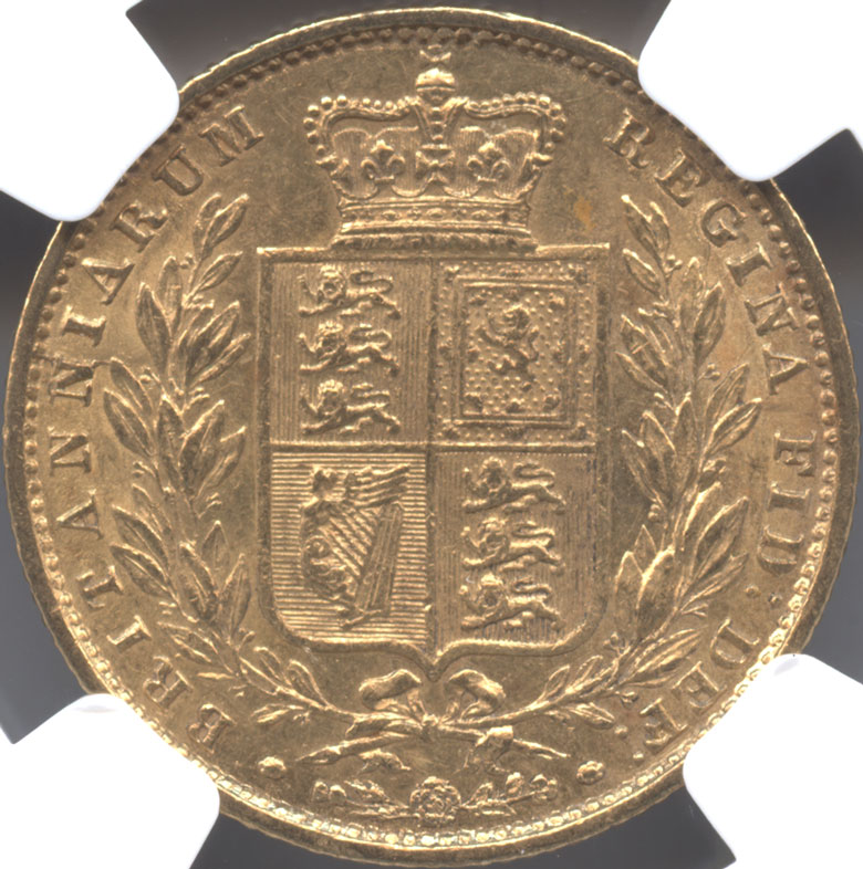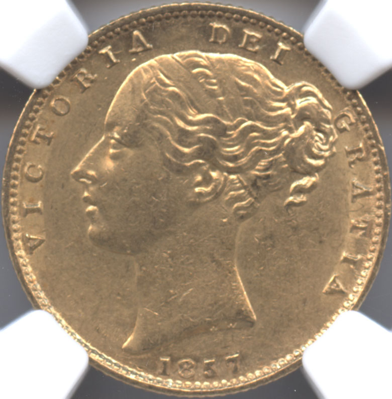 - イギリス 1ソボレン金貨 1857 ヴィクトリア(1837-1901)沈没船ドウロ号の財宝 NGC-AU58 極美品+