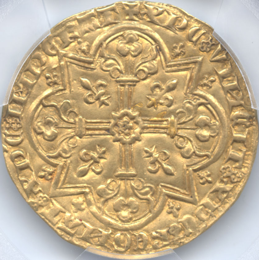 大変美しい中世フランスの芸術品で近年値段が上がってきている1枚で、PCGS社よりAU58の評価を得ています。