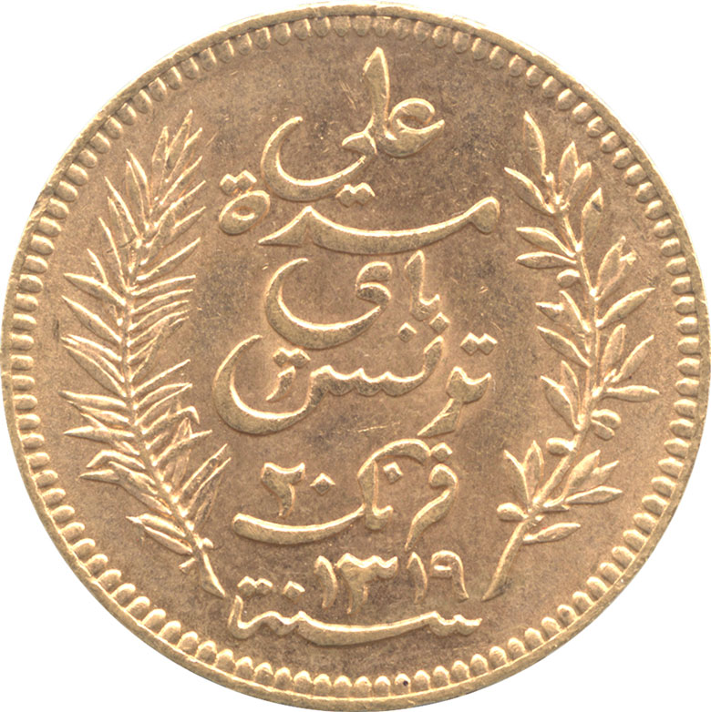 チュニジアは1881年にフランスの保護領となり、その結果、チュニジアの通貨制度はフランスの影響を強く受けるようになりました。この20フラン金貨も、フランスの金融システムに合わせた貨幣改革の一環として発行されました。