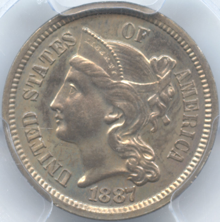- アメリカ 3セント白銅貨 1887/6 オーバーデート コロネットヘッド PCGS-PR64 プルーフ・完全未使用品