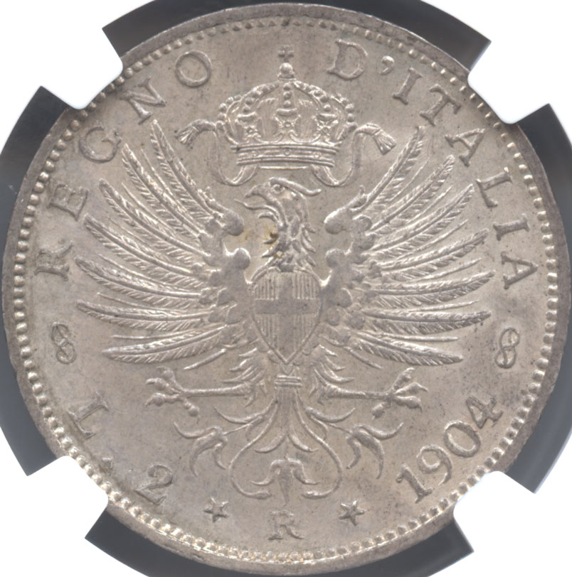 - イタリア 2リレ銀貨 1904(R) ヴィットリオ・エマヌエル3世(1900-1946) NGC-MS64+ 完全未使用品 【希少年号・希少品】