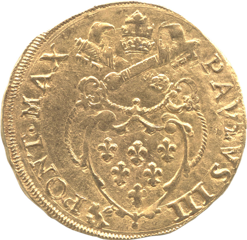 パウロ3世教皇(在位1534年~1549年)下で発行された1スクードドーロ金貨です。