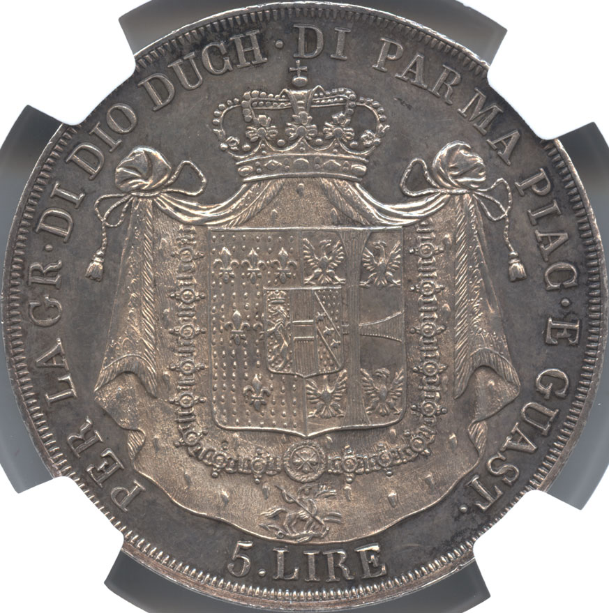 銘文「PER LA GRAZIA DI DIO DUCH. DI PARMA PIAC. E GUAST. 5 LIRE」 は 「神の恩寵によるパルマ・ピアチェンツァ・グアスタッラ公 5リレ」を意味します。