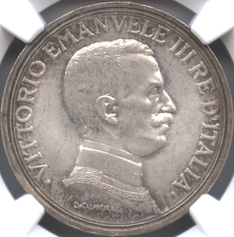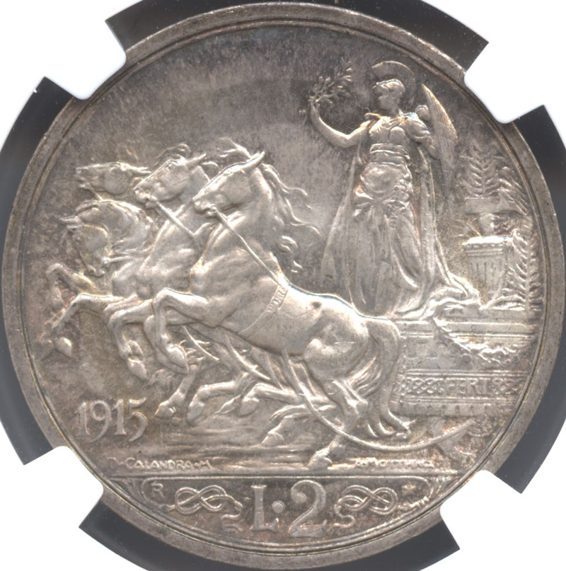 - イタリア 2リレ銀貨 1915(R) ヴィットリオ・エマヌエル3世(1900-1946) クァドリガ NGC-MS66 完全未使用品