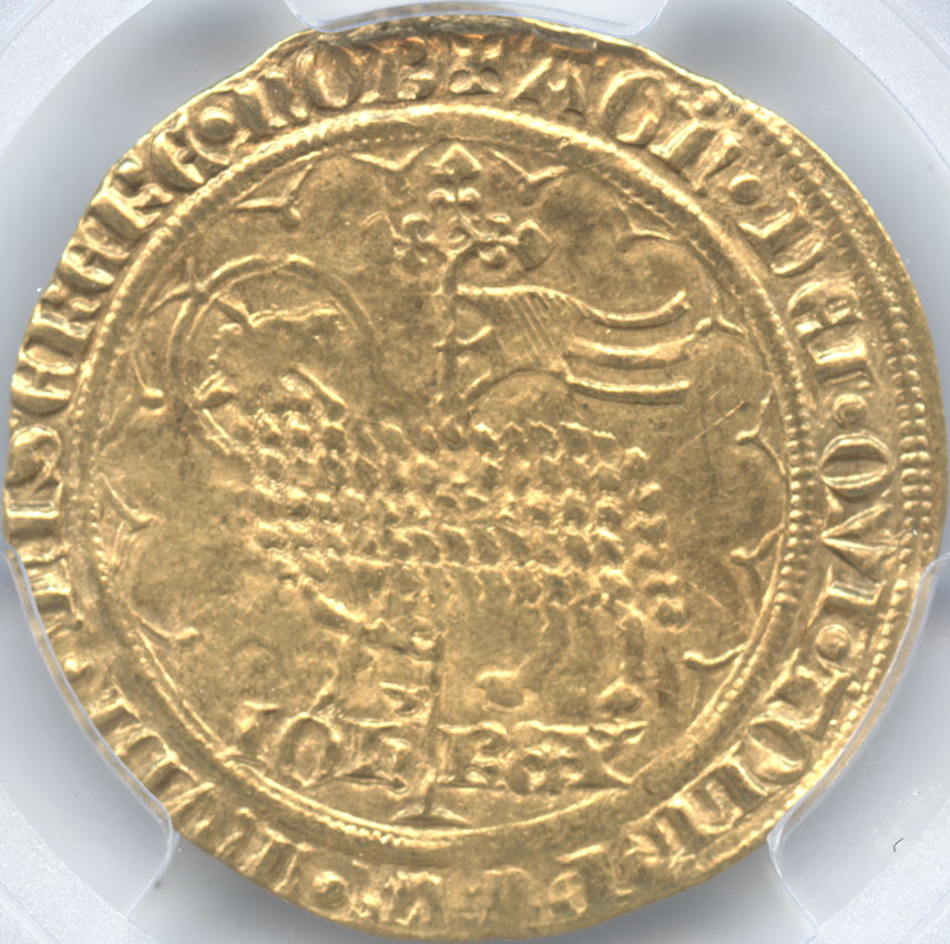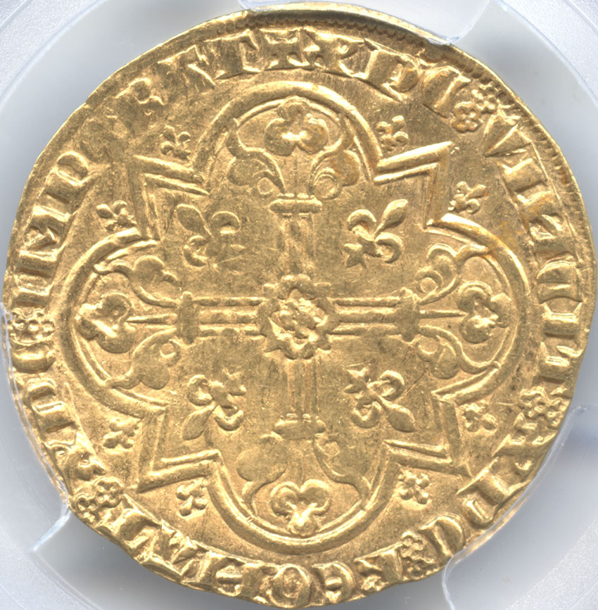 大変美しい中世フランスの芸術品で近年値段が上がってきている1枚で、PCGS社よりAU58の評価を得ています。