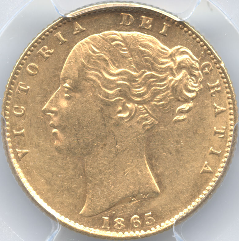 イギリス 1ソボレン金貨 1865 ヴィクトリア(1837-1901) ヤングヘッド Die.No.8 PCGS-AU58 極美品