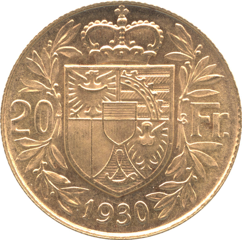 1930年リヒテンシュタイン発行の20フランケン金貨です。