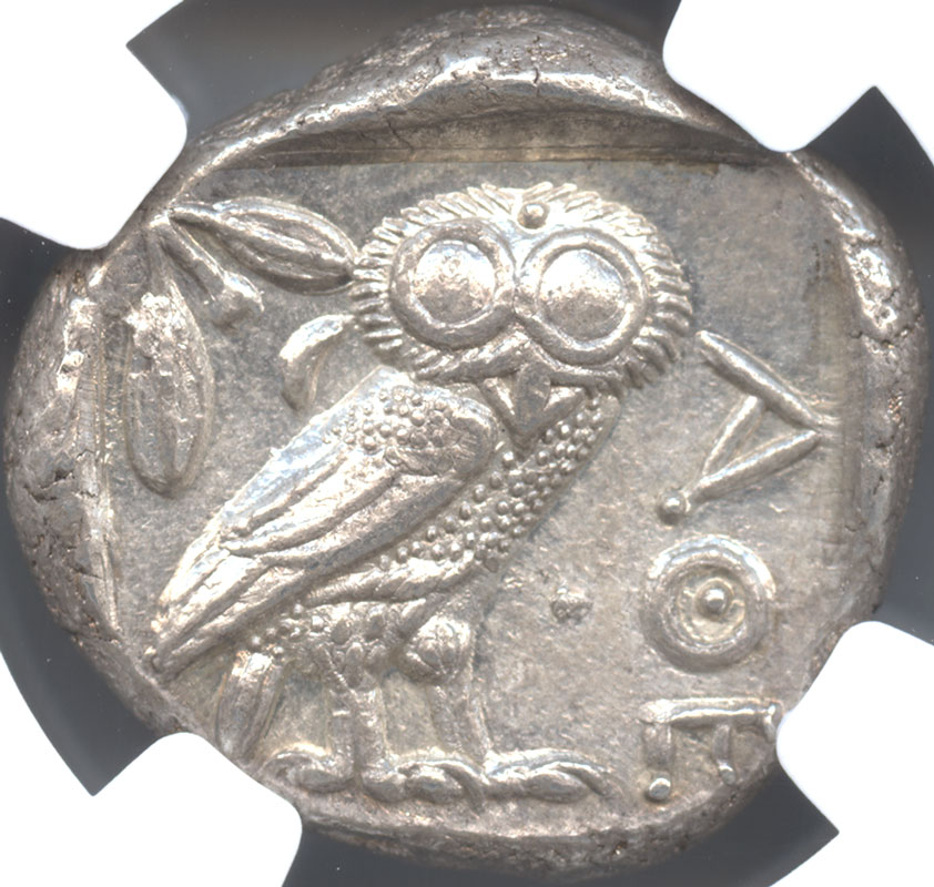 - 古代ギリシャ アッティカ地方アテネ テトラドラクマ銀貨 推定440年~紀元前404年発行 女神アテナ・フクロウ NGC-Ch AU Strike:5/5 Surface:5/5