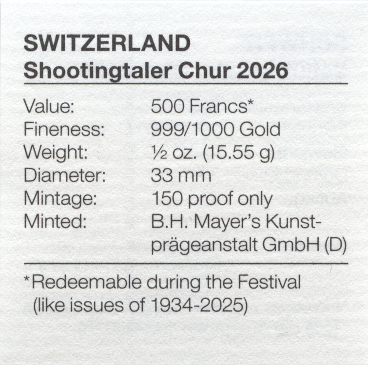 2026年のデザインは表面にウィリアム・テル、裏面にスイスを象徴する寓意的な女神と市のシンボルである角のあるヤギが描かれています。