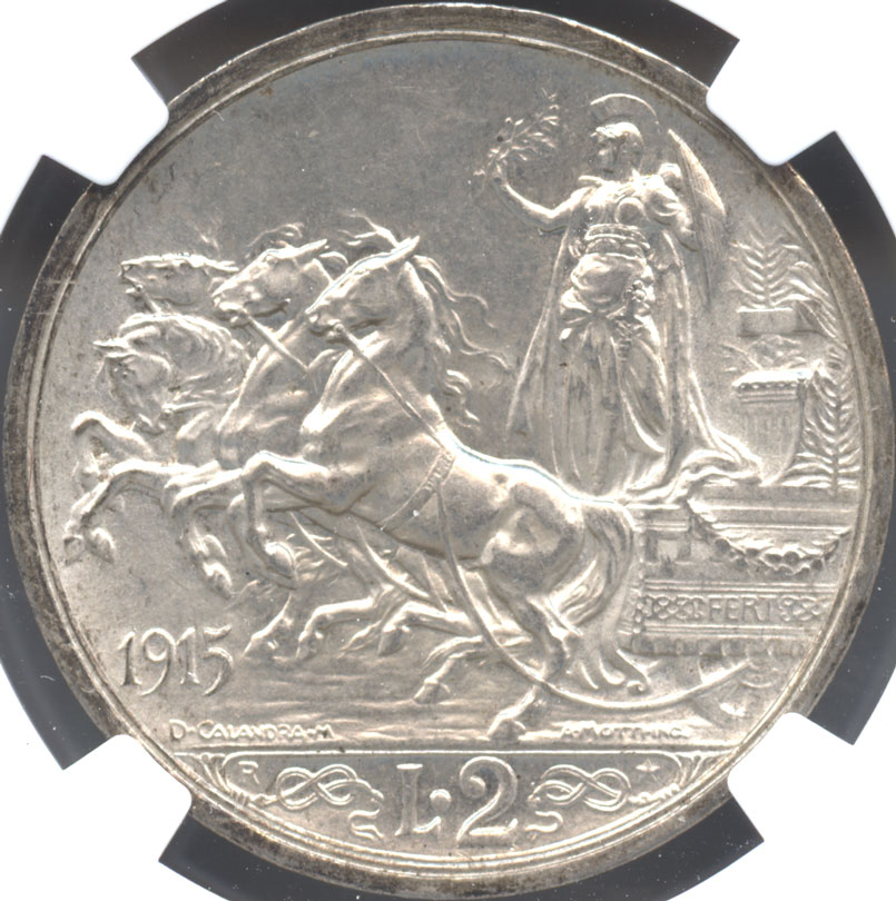 - イタリア 2リレ銀貨 1915(R) ヴィットリオ・エマヌエル3世(1900-1946) クァドリガ NGC-MS64