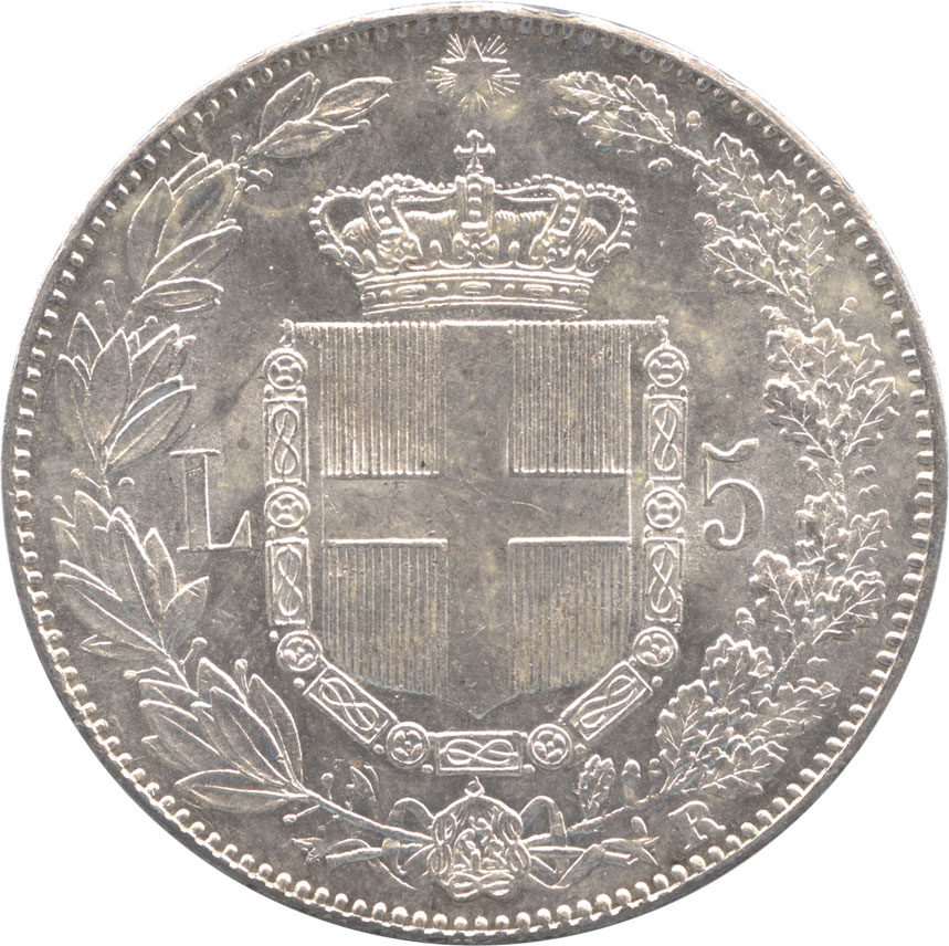 1879年イタリア王国発行の5リレ銀貨です。