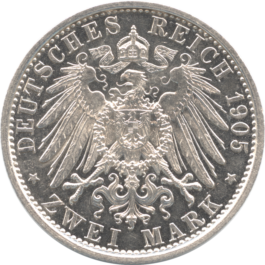 - ドイツ シュヴァルツブルク・ゾンダーズハウゼン 2マルク銀貨 1905 カール・ギュンター治世25年 プルーフ・未使用品