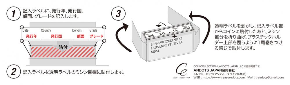 ②記入ラベルは、強粘着性のりを使用した上質紙。 コインの情報を記入した